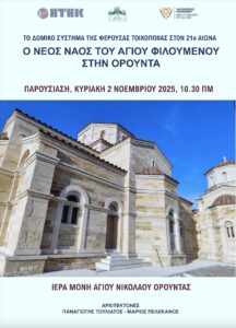 ΑνακοινώσειςΕπίκαιρες Ανακοινώσεις ΠΑΡΟΥΣΙΑΣΗ: Ο νέος ναός του Αγίου Φιλουμένου στην Ορούντα. Το δομικό σύστημα της φέρουσας τοιχοποιίας στον 21ο αιώνα (Κυριακή 2 Νοεμβρίου 2025, 10:30 π.μ., Ιερά Μονή Αγίου Νικολάου Ορούντας) 15 Οκτωβρίου 2025 FacebookTwitterWhatsAppEmailΤυπώνωViber