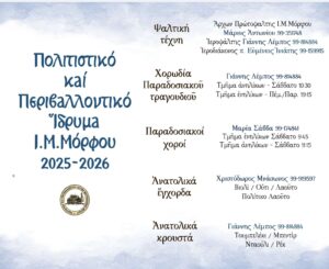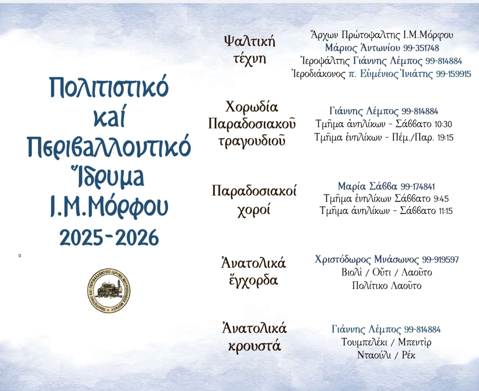 Έναρξη μαθημάτων ψαλτικής τέχνης, παραδοσιακών χορών και τραγουδιών, ανατολικών εγχόρδων και κρουστών στο Πολιτιστικό και Περιβαλλοντικό Ίδρυμα της Μητροπόλεως Μόρφου (2025-2026)