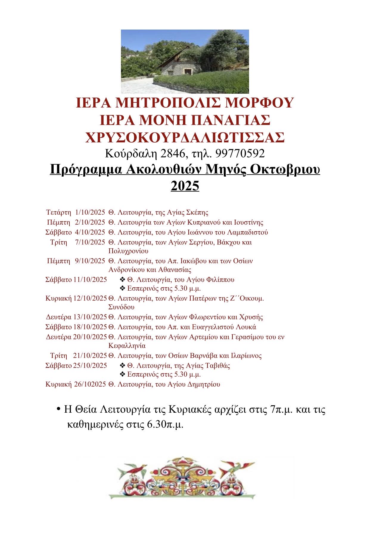 Προγράμματα Ακολουθιών και Ενοριακές Πληροφορίες Κούρδαλι – Ιερά Μονή Παναγίας Χρυσοκουρδαλιωτίσσης 3 Σεπτεμβρίου 2025 FacebookTwitterWhatsAppEmailΤυπώνωViber