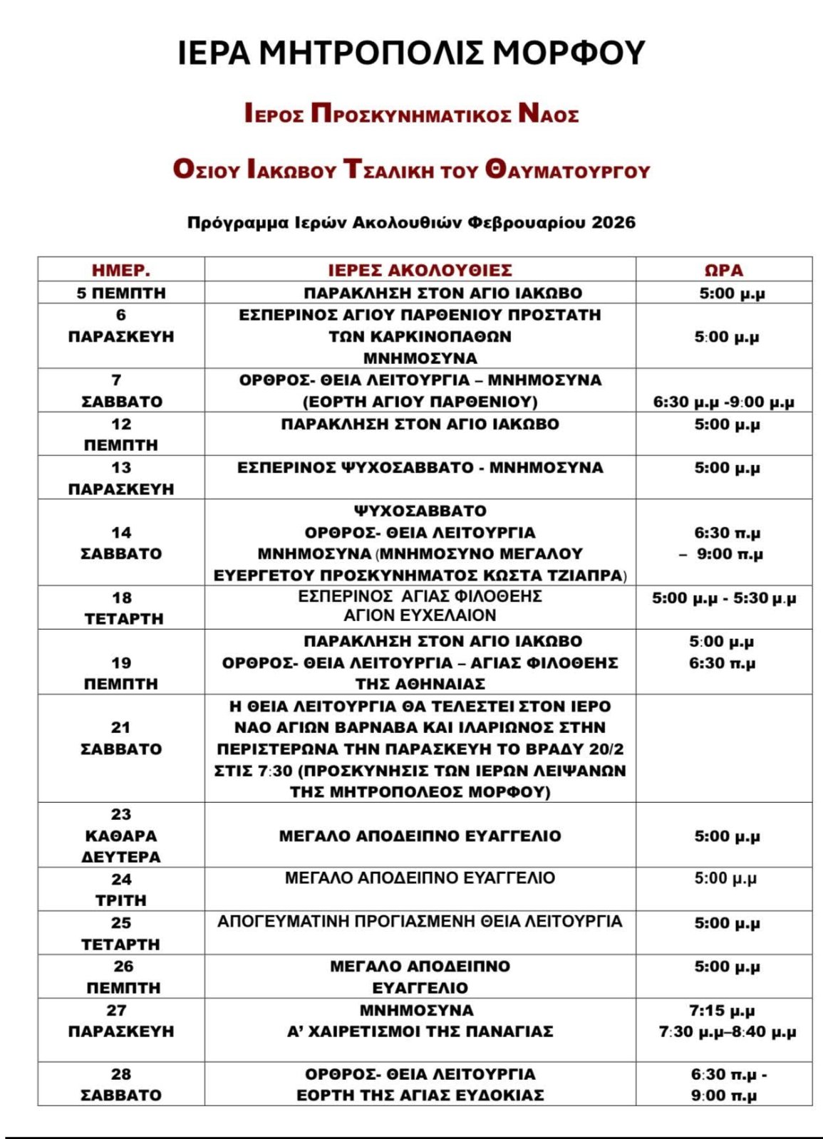 Προγράμματα Ακολουθιών και Ενοριακές Πληροφορίες Ἱερὸς Προσκυνηματικὸς Ναὸς Ὁσίου Ἰακώβου Τσαλίκη τοῦ Θαυματουργοῦ 2 Φεβρουαρίου 2026 FacebookTwitterWhatsAppEmailΤυπώνωViber