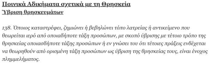138. Όποιος καταστρέφει, ζημιώνει ή βεβηλώνει τόπο λατρείας ή αντικείμενο που θεωρείται ιερό από οποιαδήποτε τάξη προσώπων, με σκοπό ύβρισης με τέτοιο τρόπο της θρησκείας οποιασδήποτε τάξης προσώπων ή εν γνώσει του ότι τέτοιες πράξεις ενδέχεται να θεωρηθούν από ορισμένη τάξη προσώπων ως ύβριση της θρησκείας τους, είναι ένοχος πλημμελήματος. Προσβολή θρησκευτικών αισθημάτων με λόγια ή πράξεις